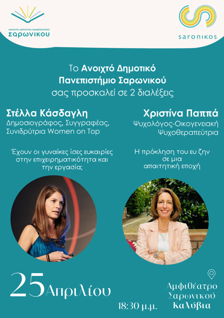 Το Ανοιχτό Δημοτικό Πανεπιστήμιο Σαρωνικού σας προσκαλεί την Πέμπτη 25 Απριλίου και ώρα 18.00 μ.μ., στο Αμφιθέατρο Σαρωνικού στα Καλύβια. σε δύο διαλέξεις που αξίζει να παρακολουθήσετε!